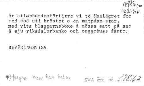 //// \W<!ov //// Är attanhundraförtitre vi te Moalägret for med mod uti bröstet o en matpåse stor. med vita blaggarnsböxe å mössa satt på sne å sju riksdalerbanko och tuggebuss därte. //// BEVÄRINGSVISA //// ^ fcU, SVA ^ ////