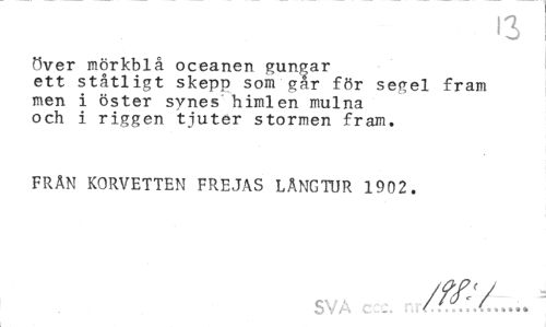 //// 13 //// över mörkblå oceanen gungar //// ett ståtligt skepp som går för segel fram //// men i öster synes himlen mulna //// och i riggen tiuter stormen fram. //// FRÄN KORVETTEN FREJAS LÅNGTUR 1902. //// SVA c , /WL... ////
