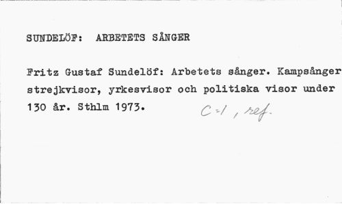 //// SUNDELÖF: ARBETETS SÅNG-ER //// Fritz Gustaf Sundelöf: Arbetets sånger. Kampsångei strejkvisor, yrkesvisor och politiska visor under 130 år. Sthlm 1973. C'-/ ////