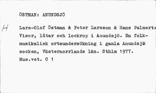 //// ÖSTMAN: ANUNDSJÖ //// Lars-Olof Östman & Peter Larsson & Hans Palmert Visor, låtar och lockrop i Anundsjö. En folkmusikalisk ortsundersökning i gamla Anundsjä socken, Västernorrlands län. Sthlm 1977. Mus.vet. C 1 ////