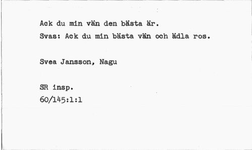 //// Ack du min vän den bästa är. //// Svas: Ack du min bästa vän och ädla ros. //// Svea Jansson, Nagu //// SR insp. 60/145:1:1 ////