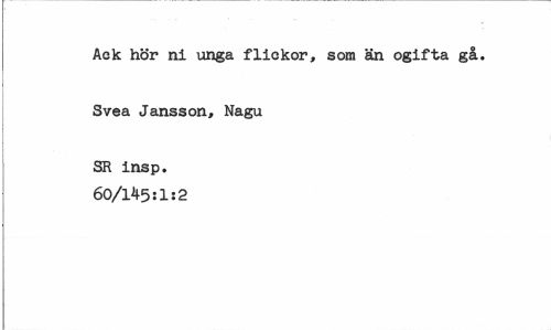 //// Ack hör ni unga flickor, som än ogifta gå. //// Svea Jansson, Nagu //// SR insp. 60/145:1:2 ////