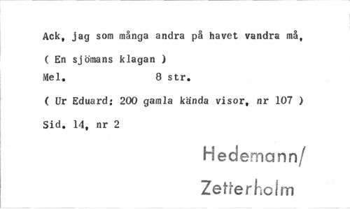 //// Ack, jag som många andra på havet vandra må, //// ( En sjömans klagan ) Mel. 8 str. //// ( Ur Eduard; 200 gamla kända visor, nr 107 ) //// Sid. 14, nr 2 //// Hedemann/ Zetterholm ////
