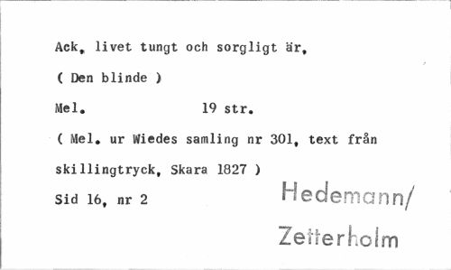 //// Ack, livet tungt och sorgligt är, //// ( Den blinde ) //// Mel. 19 str. //// C Mel. ur Wiedes samling nr 301, text från //// skillingtryck, Skara 1827 ) //// Sid 16. nr 2 //// H ederna nn/ Zetterholm ////