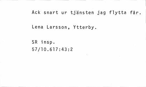 //// Ack snart ur tjänsten jag flytta får. //// Lena Larsson, Ytterby. //// SR i nsp. 57/10.617:43:2 ////