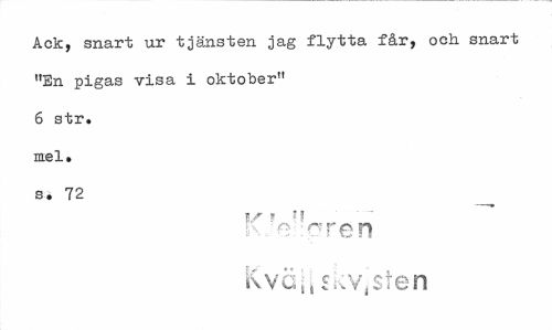 //// Ack, snart ur tjänsten jag flytta får, och snart "En pigas visa i oktober" 6 str. mel. s. 72 //// i/i !| //// k, b h r e n Kväi[skvi:sten ////