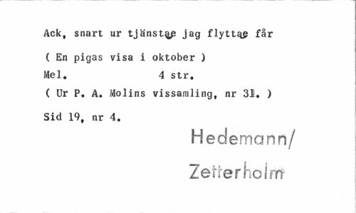 //// Ack, snart ur tjänst^ jag flyttqg får //// ( En pigas visa i oktober ) //// Mel. 4 str. //// ( Ur P. A. Molins vissamling, nr 31. ) //// Sid 19, nr 4. //// Hedemann/ Zetlerhoim ////