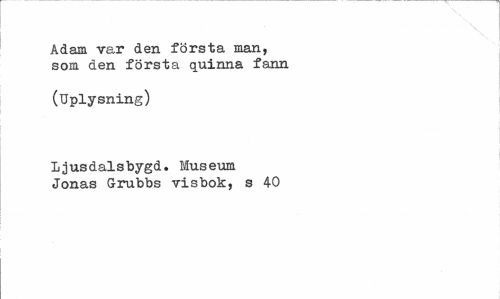 //// Adam var den första man, som den första quinna fann //// (Uplysning) //// Ljus dals bygd. Museum Jonas Grubbs visbok, s 40 ////