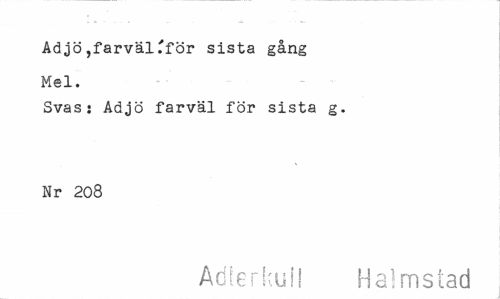 //// Ad jö ,farväl .'för sista gång Mel. //// Svas: Adjö farväl för sista g. Nr 208 //// Adlerkull Halmstad ////