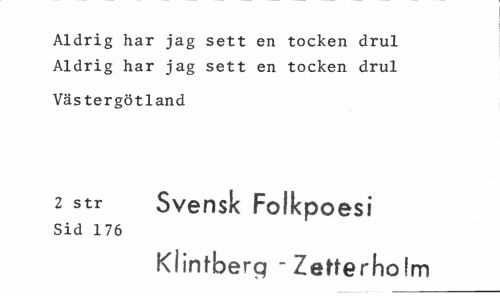//// Aldrig har jag sett en töcken drul Aldrig har jag sett en töcken drul //// Västergötland //// 2 str Svensk Folkpoesi //// Sid 176 //// Klintberg -Zetterholm ////