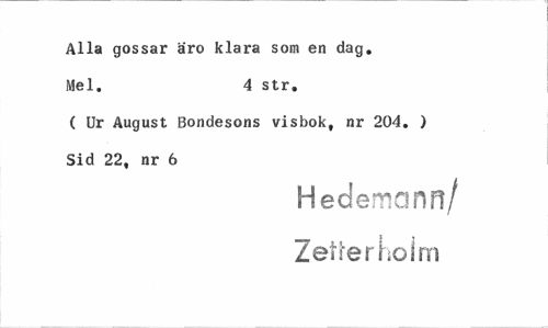 //// Alla gossar ä'ro klara som en dag. Mel. 4 str. //// ( Ur August Bondesons visbok, nr 204. ) Sid 22, nr 6 //// Hedemann/ Zetterhoim ////