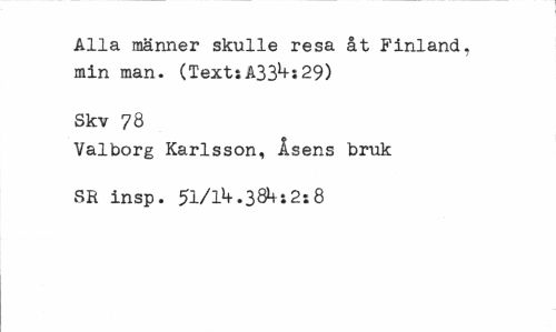 //// Alla männer skulle resa åt Finland, min man. (TextsA33^*.29) //// Skv 78 //// Valborg Karlsson, Åsens bruk SR insp. 5l/ll+.38l+i2i8 ////