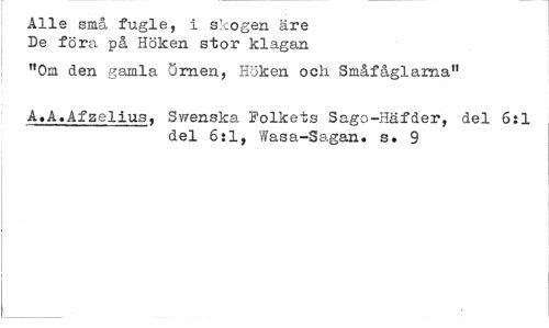 //// Alle små fugle, i skogen äre De föra på Höken stor klagan //// "Om den gamla örnen, Höken och Småfåglarna" //// A.A.Afzelius, Swenska Folkets Sago-Häfder, del 6:1 del 6:1, Wasa-Sagan. s. 9 ////
