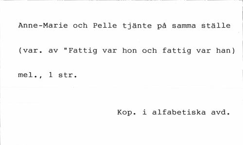 //// Anne-Marie och Pelle tjänte på samma ställe (var. av "Fattig var hon och fattig var han) mel., 1 str. //// Kop. i alfabetiska avd. ////