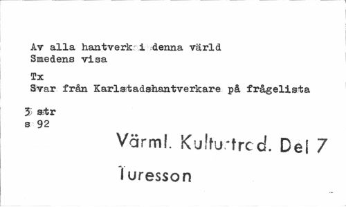 //// Av alla hantverk i denna värld Smedens visa //// Tx //// Svar från Karlstadshantverkare på frågelista //// 3; str s 92 //// Vörml. Ku Itu rtrc d. Del 7 luresson ////