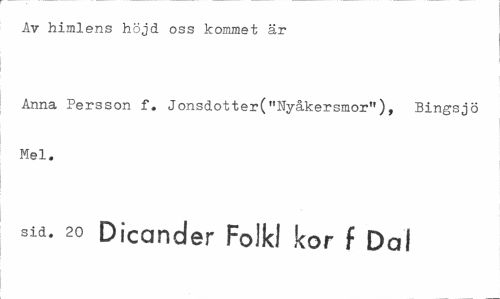 //// Av himlens höjd oss kommet är //// Anna Persson f. Jonsdotter("Nyåkersmor"), Bingsjö Mel. //// sid. 20 Dicander Folk) kor f Dal ////