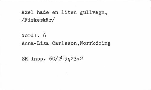 //// Axel hade en liten gullvagn, /Fiskeskär/ //// Nordl. 6 //// Anna-Lisa Carlsson,Norrköoing SR insp. 60/2^-9",23: 2 ////