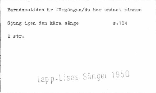 //// Barndomstiden är förgången/du har endast minnen Sjung igen den kära sånge s.104 //// 2 str. //// Lapp-Lis- Sår.sjer 1850 ////