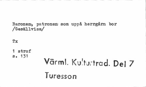 //// Baronen» patronen som uppå herrgårn bor /G-esällvisa/ //// Tx //// 1 strof s. 131 //// Värm!. Ku!tj;trad. Del 7 Turesson ////