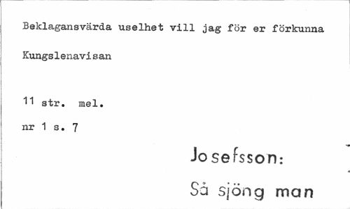 //// Beklagansvärda uselhet vill jag för er förkunna Kungslenavisan //// 11 str. mel. nr 1 s. 7 //// Josefsson: //// Så sjöng man ////
