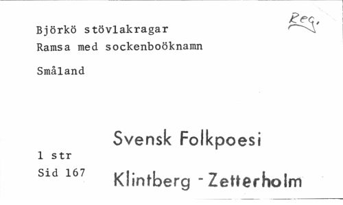 //// Björkö stövlakragar Ramsa med sockenboöknamn //// Småland //// Svensk Folkpoesi //// 1 str //// Sld 167 Klintberg -Zetterholm ////