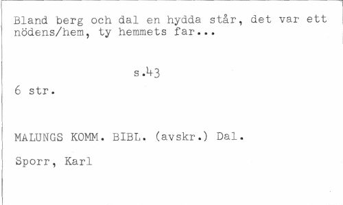 //// Bland berg och dal en hydda står, det var ett nödens/hem, ty hemmets far... //// s.^+3 //// 6 str. //// MALUNGS KOMM. BIBL. (avskr.) Dal. Sporr, Karl ////