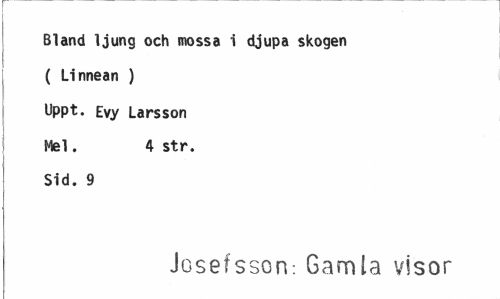//// Bland ljung och mossa i djupa skogen //// ( Linnean ) //// Uppt. Evy Larsson //// Mel. 4 str. //// Sid. 9 //// Josefsson-, Gamla visor ////