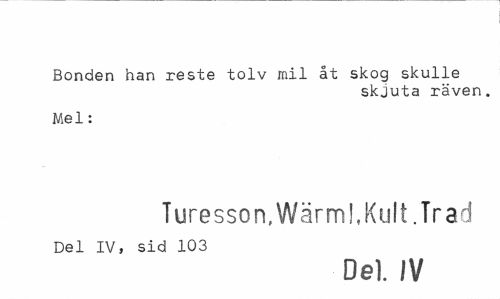 //// Bonden han reste tolv mil åt skog skulle //// skjuta räven. //// Mel: //// Turesson, Wärml, Kult. Trad //// Del IV, sid 103 //// Del. IV ////