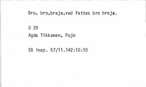 //// Bro, bro,breja,vad fattas bro breja. D 29 //// Agda Tikkanen, Pojo SR insp. 57/11.142:10:10 ////