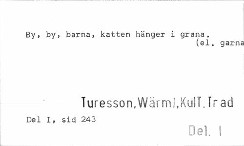 //// By, by, barna, katten hänger i grana. //// (el. garn; //// Turesson,Wärml,Kull. frad //// Del I, sid 243 //// Dal. I ////