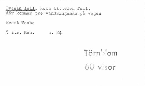 //// Byssan lull. koka kittelen full, där kommer tre vandringsmän på vägen //// Evert Taube //// 5 str. Mus. s. 24 //// T" ! ? //// 1 c rn ~ om 60 visor ////