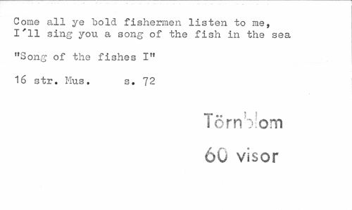 //// Corne all ye böld fishermen listen to me, I'11 sing you a song of the fish in the sea //// "Song of the fishes I" //// 16 str. Mus. s. 72 //// Törn :> om 60 visor ////