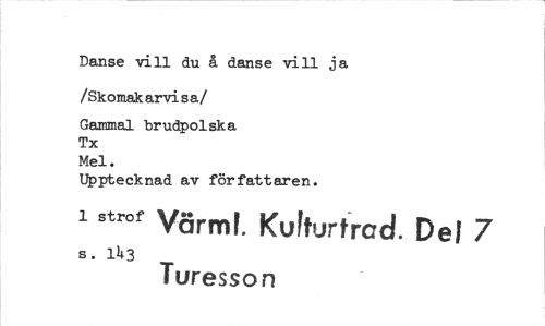 //// Danse vill du å danse vill ja //// /Skomak arvi s a / //// Gammal brudpolska //// Tx //// Mel. //// Upptecknad av författaren. //// i strof Vörm, Kulturfrcd. De, 7 //// s. 1U3 //// Turesson ////