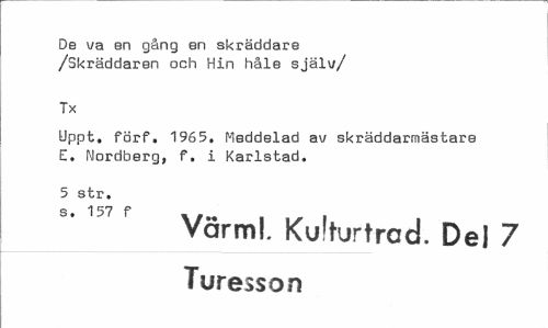 //// De va en gång en skräddare /Skräddarsn och Hin håle själv// //// Tx //// Uppt. förf. 1965. Meddelad av skräddarmästare E. Nordberg, f. i Karlstad. //// 5 str. g »1 //// Värml. Kulturtrod. Del 7 Turesson ////