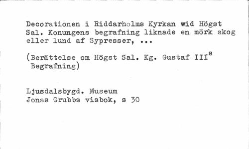 //// Decorationen i Eiddarholms Kyrkan wid Högst Sal. Konungens begrafning liknade en mörk skog eller lund af Sypresser, ... //// (Berättelse om Högst Sal. Kg. Gustaf IIIS Begrafning) //// Ljusdalsbygd. Museum Jonas G-rubbs visbok, s 30 ////