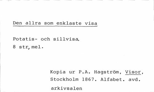 //// Den allra som enklaste visa //// Potatis- och sillvisa, 8 str, mel. //// Kopia ur P.A. Hagström, Visor, Stockholm 1867. Alfabet, avd. //// arkivsalen ////