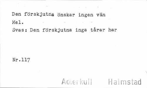 //// Den förskjutna önskar ingen vän Mel. //// Svas: Den förskjutna inga tårar har Nr.117 //// Adlerkuil Halmstad ////