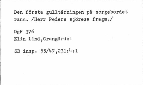//// Den första gulltärningen på sorgebordet rann. /Herr Peders sjöresa fragm./ //// DgF 376 //// Elin Lind,Grangärdet SR insp. 55A7,231:^:1 ////