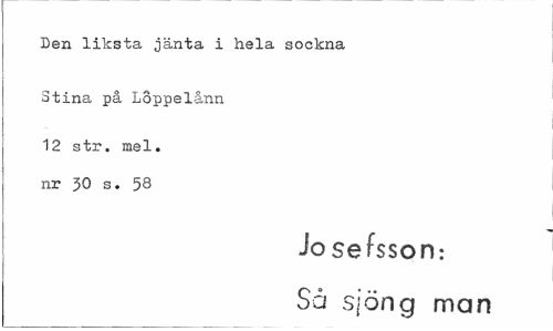 //// Den liksta jänta i hela sockna //// Stina på Loppelånn //// 12 str. mel. nr JO s. 58 //// Josefsson: Så sjöng man ////