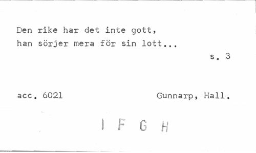 //// Den rike har det inte gott, han sörjer mera för sin lott... //// s. 3 //// acc. 6021 Gunnarp, Hall. //// I F G H ////