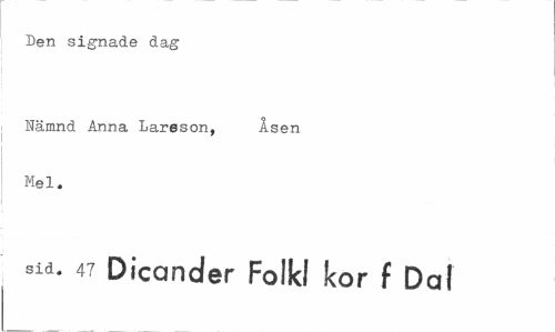 //// Den signade dag //// o //// Nämnd Anna Larsson, Asen Mel. //// ^d. 47 Dicander Folk! kor f Dal ////