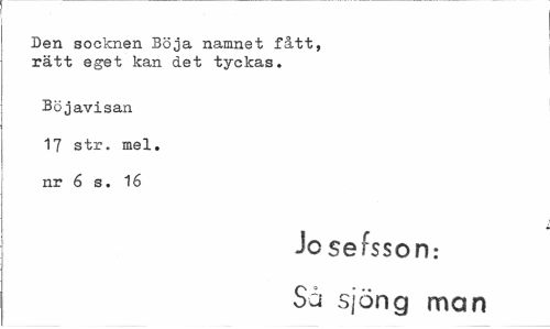 //// Den socknen Böja namnet fått, rätt eget kan det tyckas. //// Böjavisan 17 str. mel. nr 6 s. 16 //// Jo sersson: Så sjöng man ////