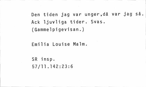 //// Den tiden jag var unger,då var jag så. Ack ljuvliga tider. Svas. (Gammelpi gevi san.) //// Emilia Louise Malm. //// SR insp. 57/1 1 . 1 42:23:6 ////