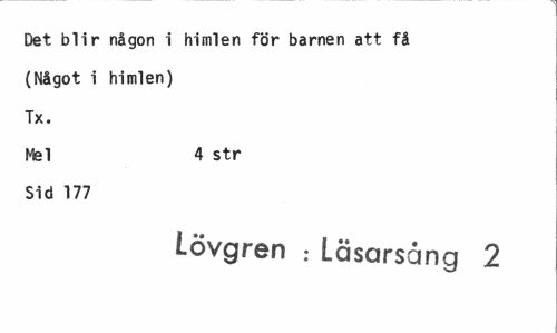 //// Det blir någon i himlen för barnen att få //// (Något i himlen) //// Tx. //// Mel 4 str //// Sid 177 //// Lövgren : Läsarsång 2 ////