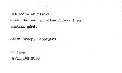 //// Det bodde en flicka. //// Svas: Det var en riker flicka i en //// enstaka gård. //// Selma Groop, Lappfjärd. //// SR insp. 57/11-142;28:6 ////