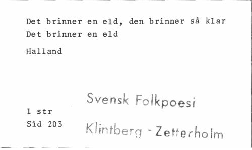 //// Det brinner en eld, den brinner så klar Det brinner en eld //// Halland //// Svensk Folkpoesi //// 1 str //// Sid 203 kJ- ,j _ , //// Klintberg - Zetterhoim ////