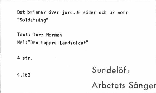 //// Det brinner över jord.Ur söder och ur norr "Soldatsång" //// Text: Ture Nerman //// Mel:"Den tappre Landsoldat" //// 4 str. //// Sundelöf: //// s .163 //// Arbetets Sånge ////