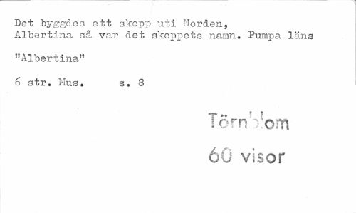 //// Det byggdes ett skepp uti Norden, //// Albertina så var det skeppets namn. Pumpa läns //// "Albertina" //// 6 str. Mus. s. 8 //// T.. //// . orn rom 60 visor ////