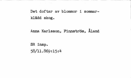 //// Det doftar av blommor cccxliv sommar- //// klädd skog. //// Anna Karlsson, Finnström, Åland //// SR insp. 58/11.869:15:4 ////