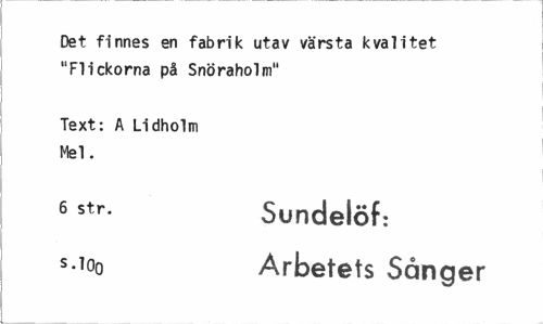//// Det finnes en fabrik utav värsta kvalitet "Flickorna på Snöraholm" //// Text: A Lidholm Mel. //// 6 str- Sundelöf: //// s-ioo Arbetets Sånger ////